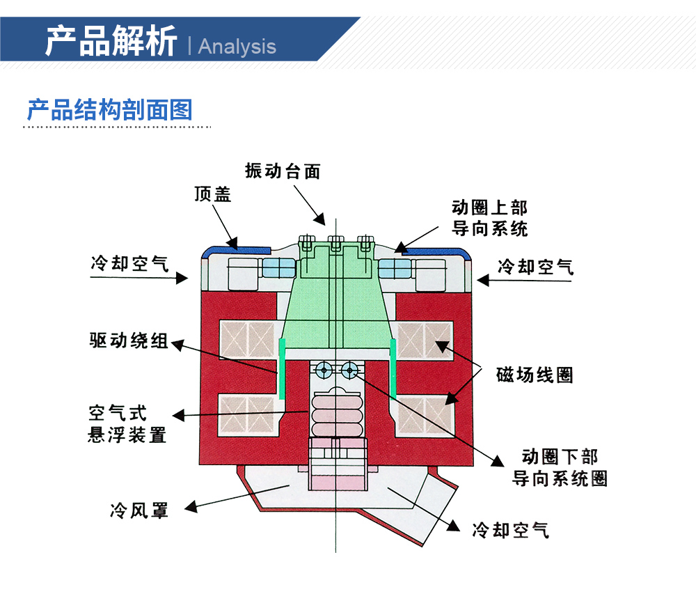性能特點:●強制風(fēng)冷 ●正弦激振力范圍: 1kN ~ 70kN●兩倍的正弦沖擊力(2噸以上可選三倍) ●輕質(zhì)動圈,優(yōu)化設(shè)計,耐振性能強●中心氣囊承載能力強,低頻性能好 ●可配置水平滑臺●風(fēng)機冷卻效果好,噪音低 ●使用頻率可從1Hz開始●隨機與正弦激振力1:1 ●位移峰峰值最大可達(dá)100mm●耳軸氣囊隔震效果好 ●雙磁路設(shè)計,漏磁低,磁場均勻●正弦、隨機、沖擊等試驗功能 ●高效率、高可靠性功率放大器系統(tǒng)特點:◎一階共振頻率高、使用頻率寬優(yōu)化的動圈骨架結(jié)構(gòu)設(shè)計,特別是對傳統(tǒng)結(jié)構(gòu)的動圈骨架傳力角板等薄弱環(huán)節(jié)進行增強設(shè)計,有效提高了傳力剛度;采用膠接與螺釘連接的復(fù)合固定繞線環(huán)筒和繞線環(huán)筒增強膠孔的新結(jié)構(gòu),增強了繞組的剛度。顯著提高了動圈的一階共振動頻率,超過了國際同類產(chǎn)品。◎動圈繞組可靠性高獨創(chuàng)的動圈繞組加強環(huán)的新結(jié)構(gòu)和新工藝,顯著提高了動圈繞組工作在大推力、高加速度振動、沖擊和高溫環(huán)境中的耐振可靠性。◎風(fēng)冷效率高創(chuàng)新的電動臺冷卻風(fēng)道設(shè)計:改進了進風(fēng)結(jié)構(gòu),上磁環(huán)用長槽型進風(fēng)道取代圓孔型進風(fēng)道;勵磁線圈采用蜂窩式風(fēng)道、中磁環(huán)采用雙層風(fēng)流式風(fēng)道、下磁環(huán)采用斜楔型風(fēng)道等新結(jié)構(gòu),顯著提高了冷卻效果。◎冷卻風(fēng)機冷卻風(fēng)機具有獨特的風(fēng)道等結(jié)構(gòu)設(shè)計,風(fēng)機冷卻效果好,噪音低。◎水平和垂直試驗帶水平滑臺的電動振動臺可以用于水平和垂直試驗,兩個方向的切換方式簡單,翻轉(zhuǎn)方便。◎采用IGBT模塊功放采用性能可靠的MOSFET和IGBT模塊,具有很高的穩(wěn)定性和可靠性。◎安全性能產(chǎn)品符合歐洲標(biāo)準(zhǔn)測試要求,在功放上裝有緊急停止開關(guān),有效應(yīng)對突發(fā)事件。符合美國UL和CE安全要求。